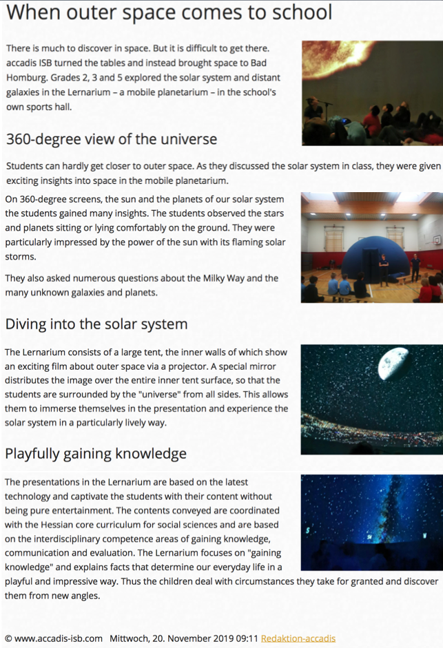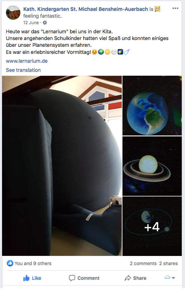 „Am Ende einer schönen Projektwoche zum Thema “Weltraum” war das Lernarium der krönenden Abschluss. Kindgerecht, faszinierend, fesselnd, kein Wort zu viel – kein Wort zu wenig, sehr professionell und absolut empfehlenswert.“